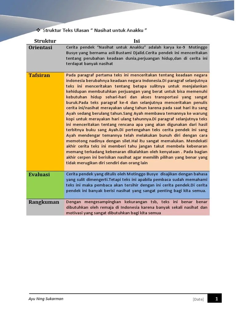 Researchers are interested in analyzing short stories that have a lot of moral value. Tentu ayah telah pergi di ambil tuhan selamanya damai di surga. Tokoh orang tua dalam cerpen tersebut menggambarkan sebuah sifat yang merasa dirinya sangat pintar dalam memberi nasehat dan semua nasehatnya dianggap benar karena menurut dirinya beliau sudah tua dan sudah banyak. Analisis nilai moral cerpen yang berjudul "nasihat untuk anakku" Kucari damai di sini (a. Dan hadits nabi sallalla'alaih wasalam. Banyak ragam nasihat yang ada dalam kehidupan ini termasuk nasihat yang tertuang dalam bentuk karya sastra lama atau yang lebih familier disebut dengan pantun. Dunia ini memang terlalu kejam terhadap ayah. Artikel kali ini akan membahas contoh cerpen motivasi singkat meliputi dari, demi sebuah impian hidup, kisah tukang kayu, dan hidup untuk meraih kesuksesan. Seorang pemimpin perlulah adil dalam melaksanakan tanggungjawabnya. Maris bersama tingkatkan taqwa dan iman. Kaduk, ayam dan raja (zurinah hassan) 2. 1 buku robohnya surau kami ini berisi 10 cerpen: